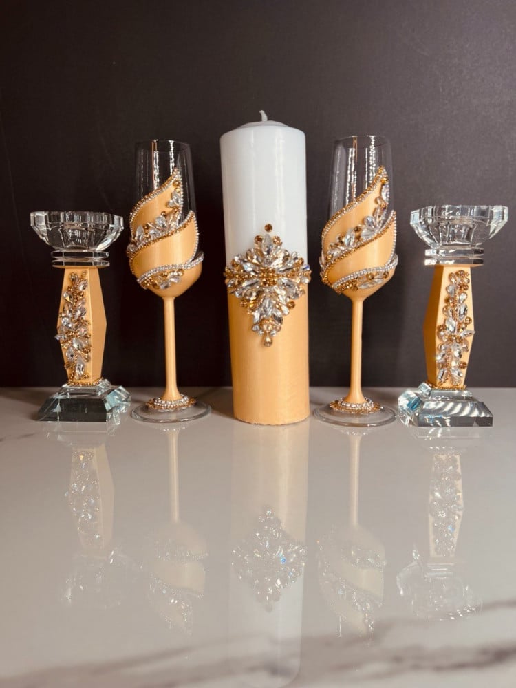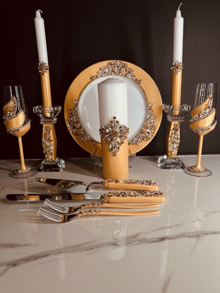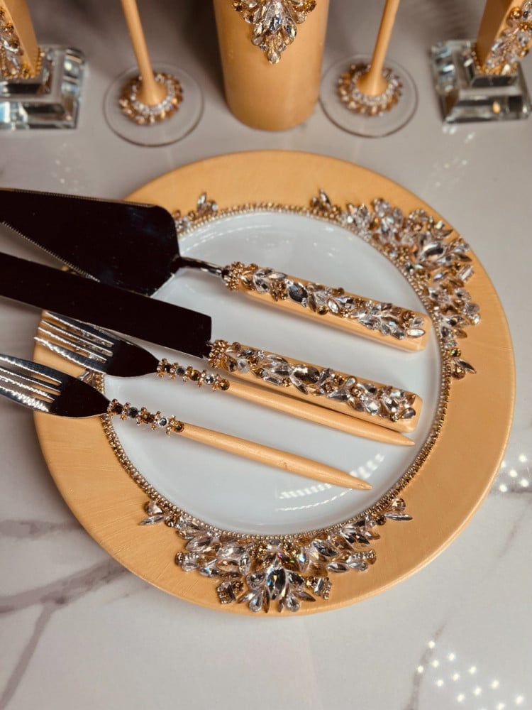 طقم الكيك الفاخر المرصع بالكريستالات للتزيد من فخامة الطقم تكسبه رونقا وجاذبية بتصاميم حصرية ومميزة وبألوان من إختيارك تناسب جميع الأذواق (قابل للغسيل وامكانية اعادة استخدامه)