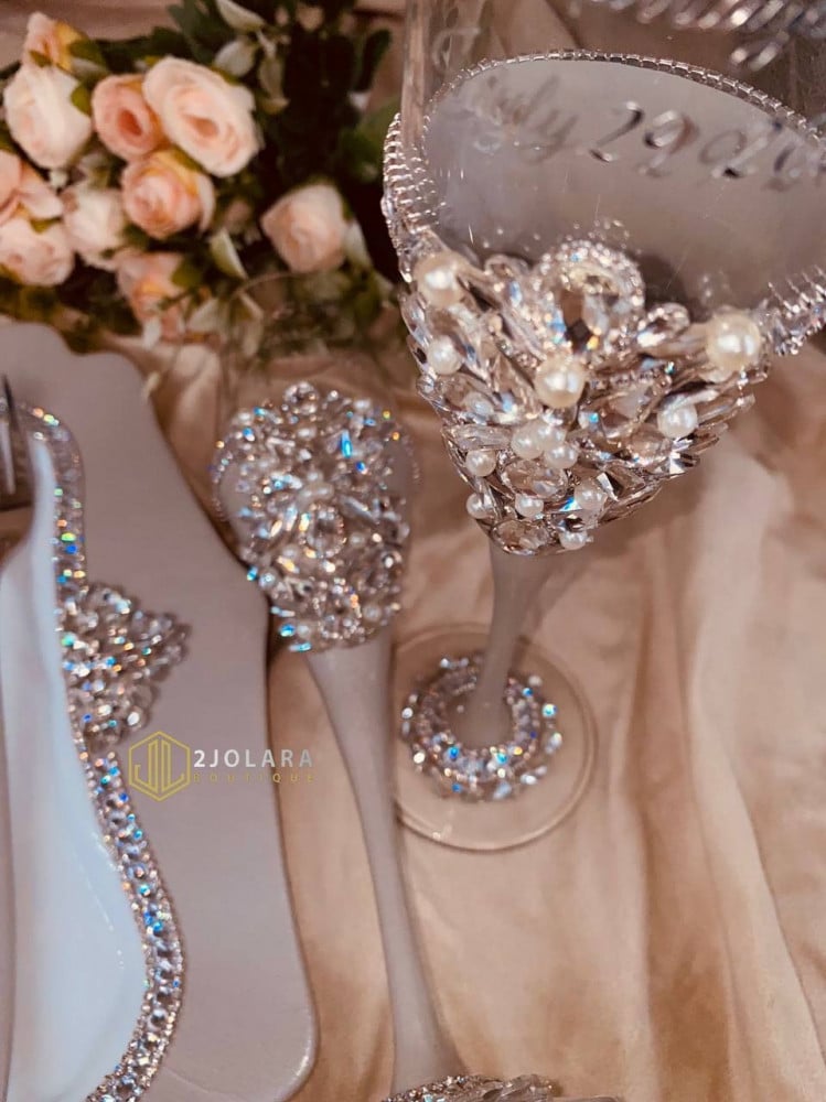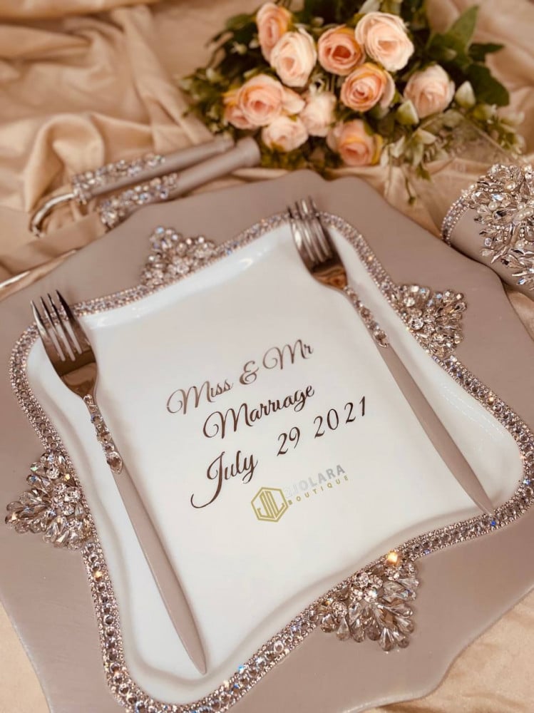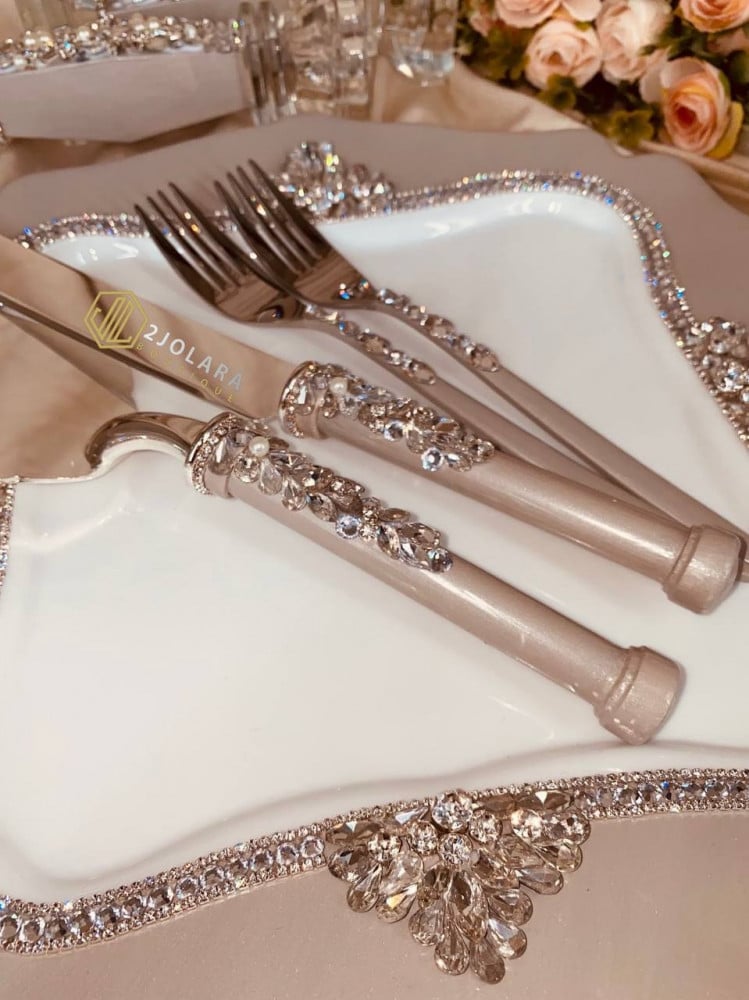 طقم الكيك الفاخر المرصع بالكريستالات للتزيد من فخامة الطقم تكسبه رونقا وجاذبية بتصاميم حصرية ومميزة وبألوان من إختيارك تناسب جميع الأذواق (قابل للغسيل وامكانية اعادة استخدامه)